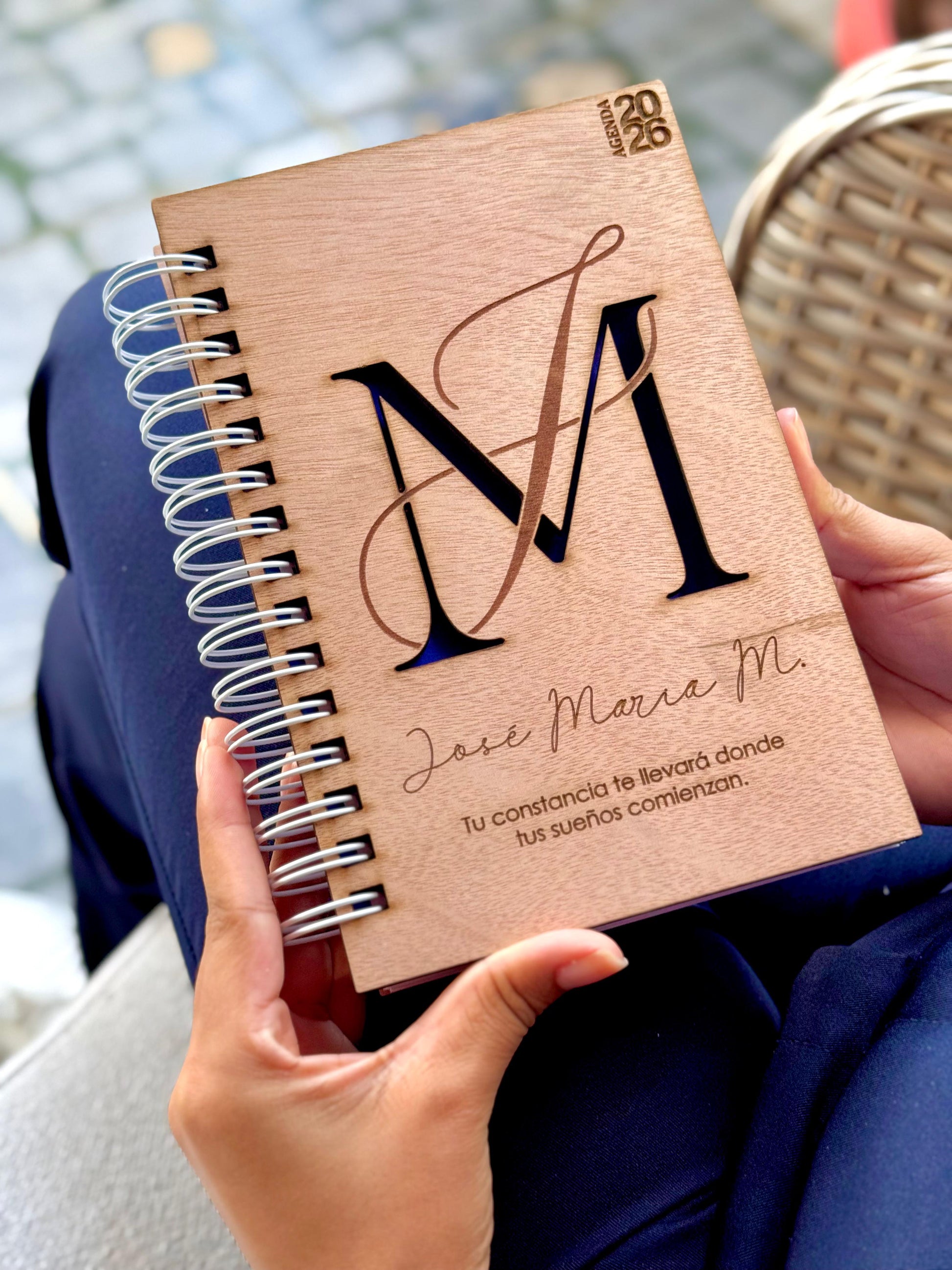 Organiza tu año con estilo y propósito con nuestra exclusiva agenda 2026 personalizada. Su portada de madera natural grabada combina sofisticación y funcionalidad, destacando una elegante inicial en relieve, tu nombre completo y una frase inspiradora que te motivará día a día.