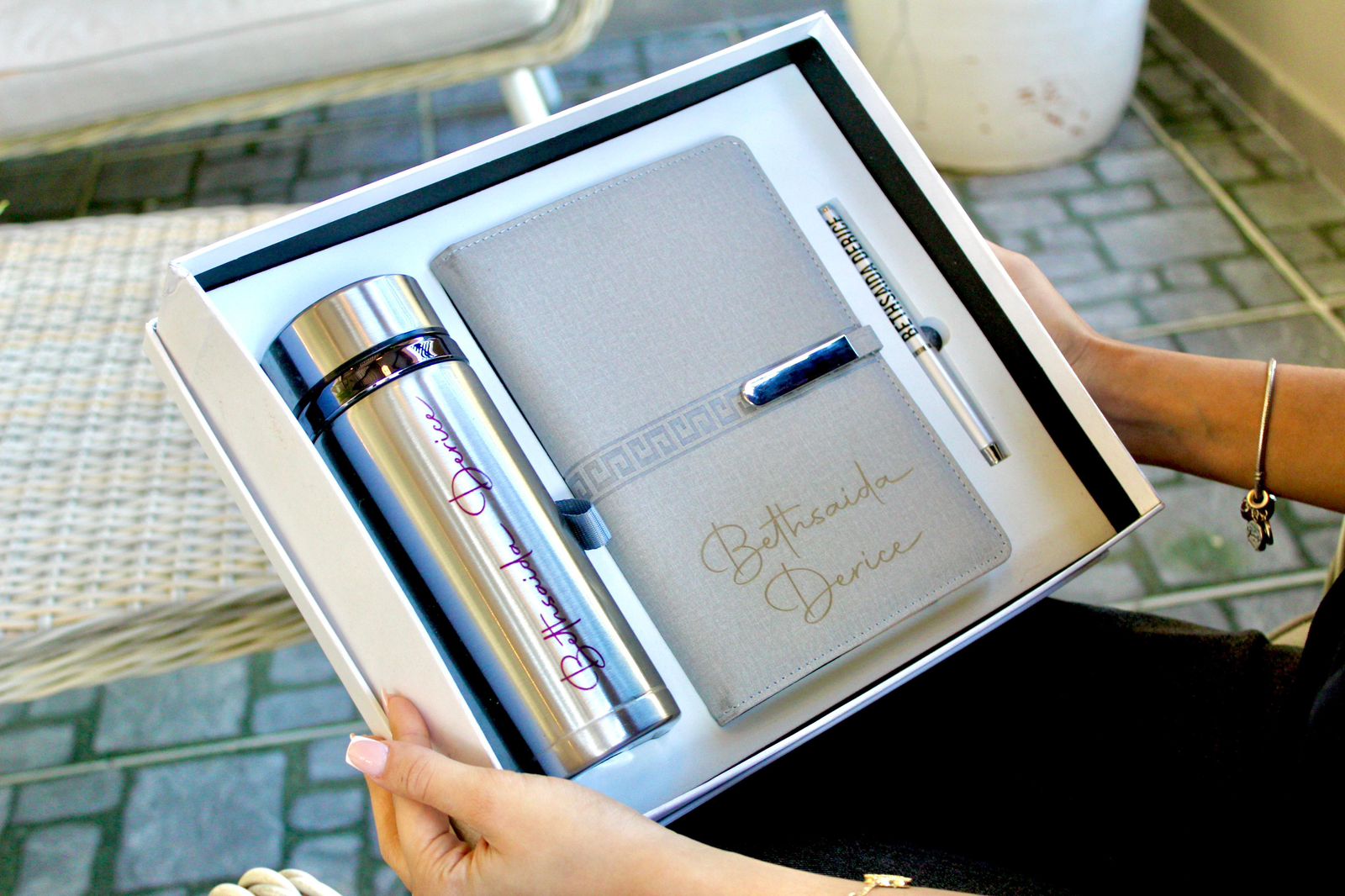 Este combo ejecutivo plateado incluye un termo, una libreta y un lapicero, ideales para acompañarte en tus reuniones y jornadas de trabajo. Su diseño elegante y funcional te permite mantenerte hidratado, organizar tus ideas y tomar notas con estilo profesional. Perfecto para quienes buscan combinar practicidad y sofisticación en su día a día.