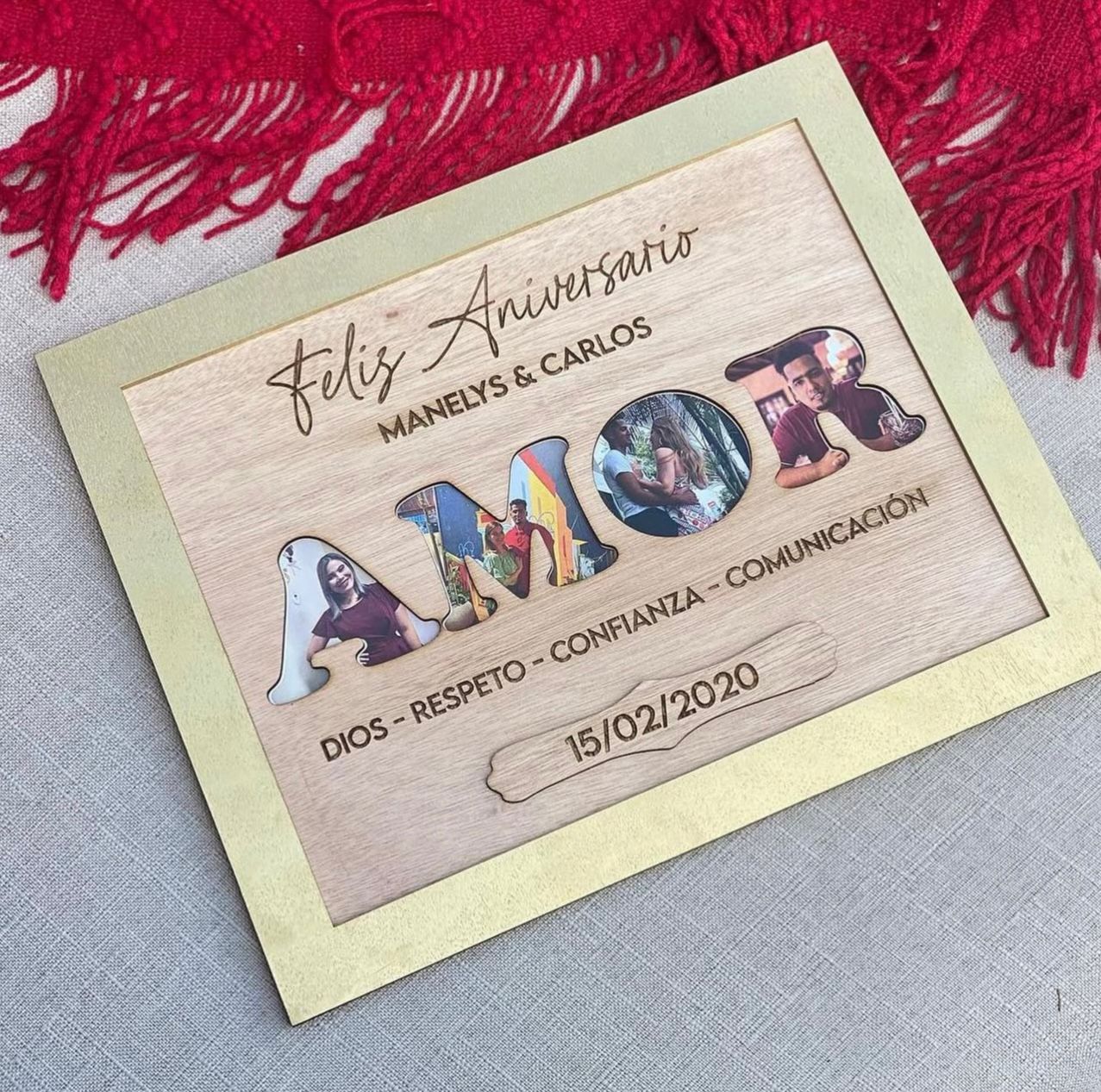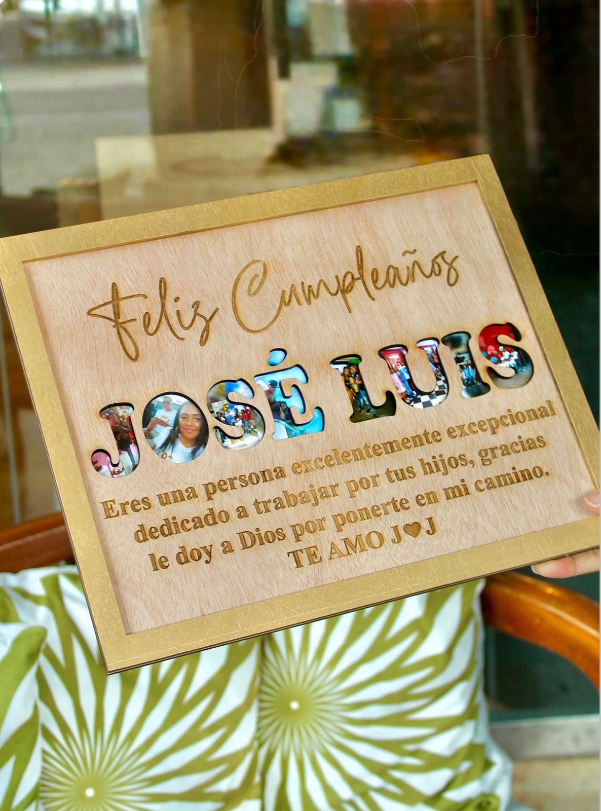 Este cuadro en madera combina arte y personalización, presentando el nombre y fotos organizadas por cada letra. Además, incluye una frase grabada que le aporta un toque único y emotivo. Perfecto para decorar espacios con un significado especial o para regalar un detalle memorable y personalizado. Su diseño elegante y acabado en madera natural realzan cualquier ambiente, haciendo de este cuadro un recuerdo duradero y lleno de estilo.
