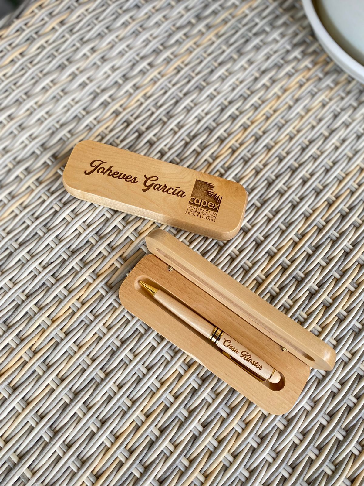 Este estuche de madera ofrece una presentación elegante y duradera para tu lapicero personalizado, ideal como regalo exclusivo o para uso personal. Su diseño sofisticado resalta la calidad del material y protege tu bolígrafo de manera segura, realzando su valor y estilo único. Perfecto para quienes buscan un detalle que combine funcionalidad y distinción en cada escritura.