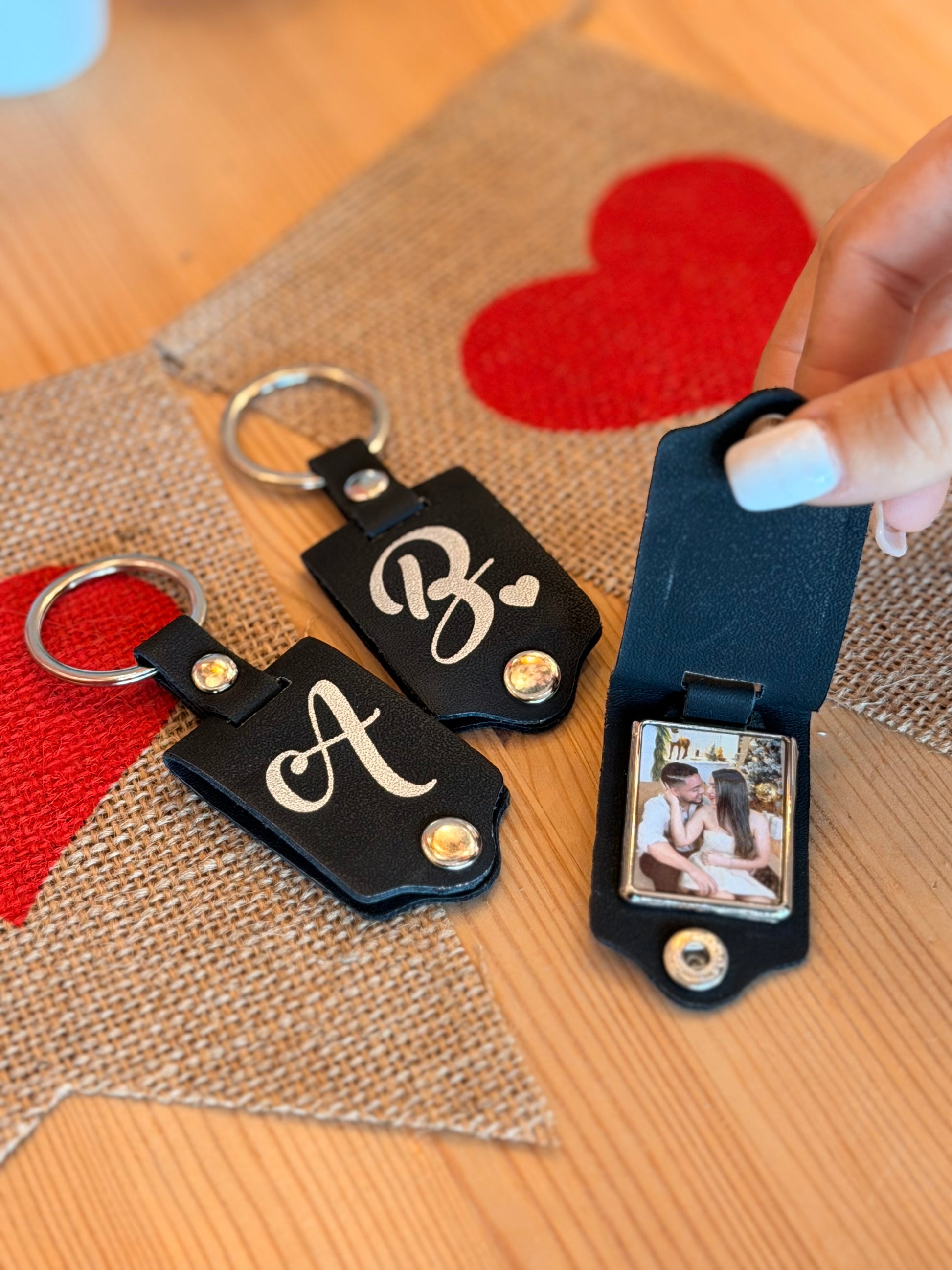 Este llavero de piel negra combina funcionalidad y personalización, al incluir una inicial y un espacio para una foto. La piel de alta calidad garantiza durabilidad, mientras que el diseño elegante presenta un toque sofisticado. Es una opción práctica para llevar recuerdos y destacar la individualidad.