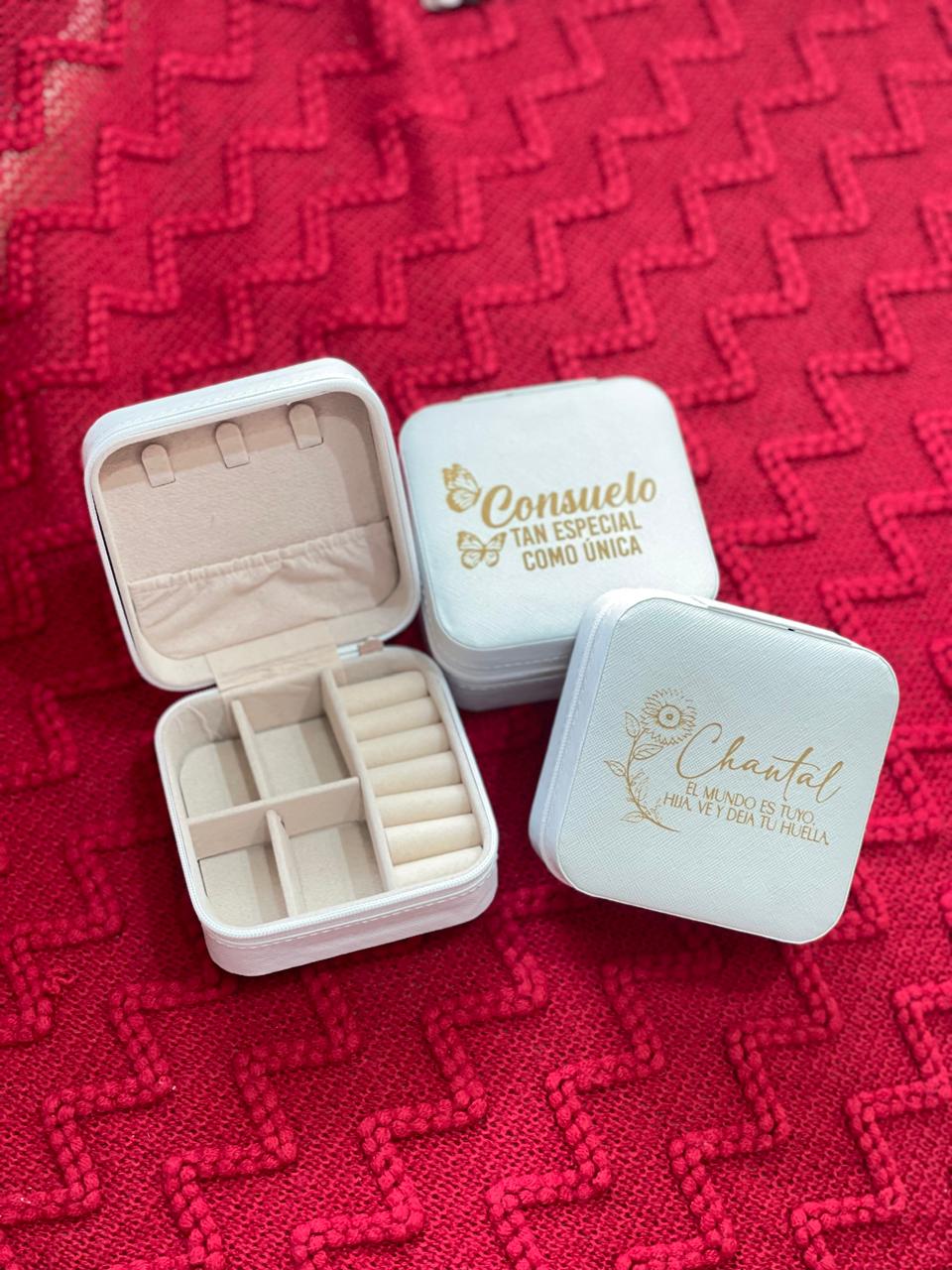 Descubre la elegancia en cada detalle con nuestros mini joyeros personalizados con grabado. Perfectos para conservar tus piezas más preciadas, estos joyeros combinan diseño compacto con un toque personal único. Regala o luce un accesorio que refleja tu estilo, protegendo tus joyas con sofisticación y exclusividad.
