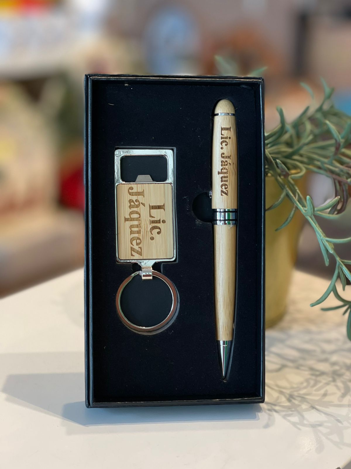 Este set combina funcionalidad y estilo en materiales naturales. El lapicero y el llavero en madera ofrecen un acabado elegante y duradero, mientras que el destapador cuadrado añade utilidad práctica en un diseño compacto. Ideal para quienes valoran la calidad y el detalle en objetos cotidianos, este set es perfecto para regalar o para uso personal, aportando un toque sofisticado y versátil a tu día a día.